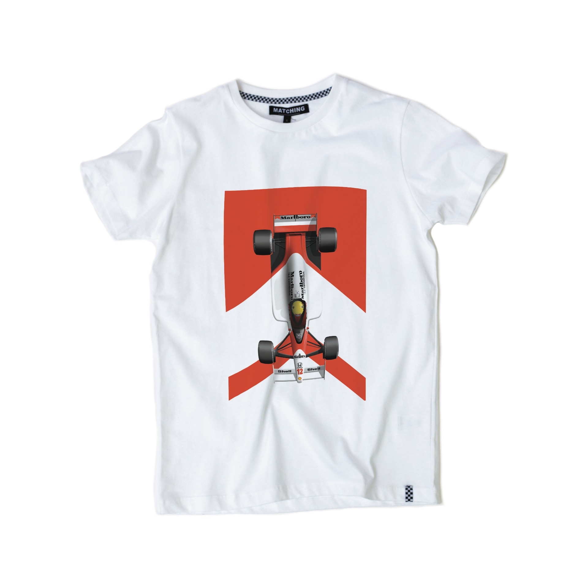 Senna et sa Mc Laren, un mythe de l'histoire automobile.. T-shirt 100% coton 180g.
